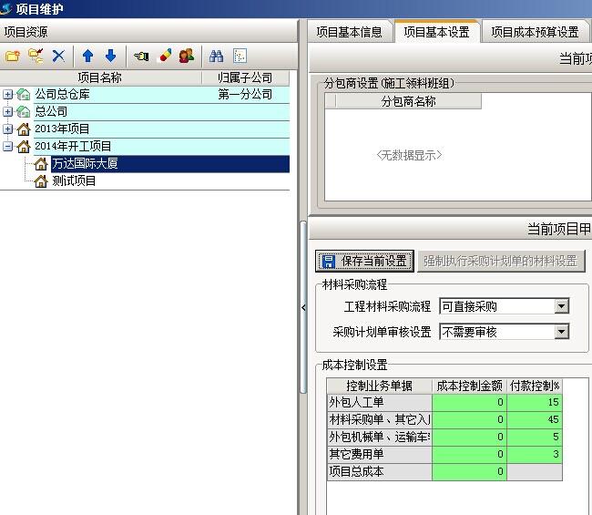 1. 以項(xiàng)目【萬(wàn)達(dá)國(guó)際大廈】為例,首先要給項(xiàng)目設(shè)定一個(gè)控制比例,在工程管理模塊【項(xiàng)目維護(hù)】中,選擇好項(xiàng)目之后,在項(xiàng)目基本設(shè)置中設(shè)置控制比例,這里的控制比例與前面的成本控制金額無(wú)關(guān),是人工、材料、機(jī)械、其他費(fèi)在付款時(shí)所占項(xiàng)目收款的控制比例。如下圖:紅框所畫(huà)位置為付款控制比例人工費(fèi)占15%、材料費(fèi)占45%、外包機(jī)械和車輛運(yùn)輸占5%、其他費(fèi)3%