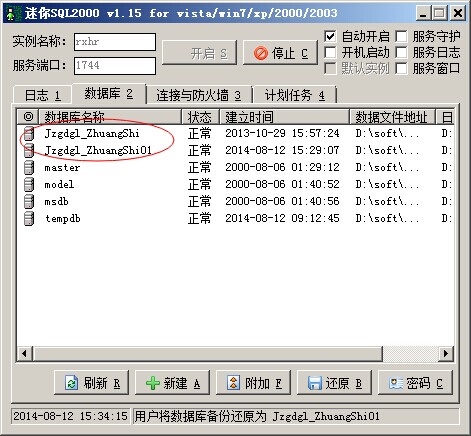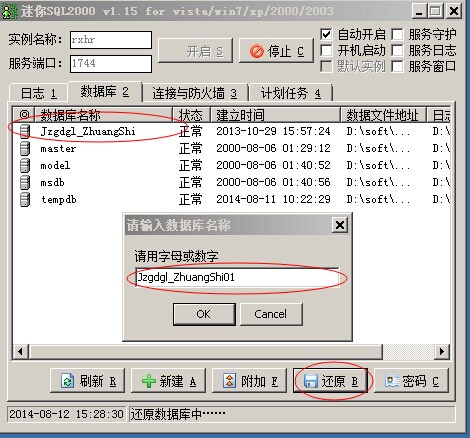 2. 數(shù)據(jù)庫(kù)還原,還原過程中需要修改數(shù)據(jù)庫(kù)名稱,與現(xiàn)有的數(shù)據(jù)庫(kù)名稱不同。
