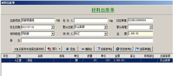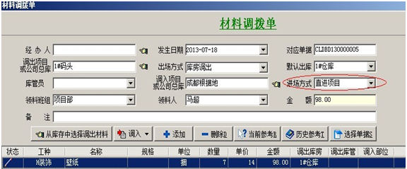 3. 【材料調(diào)撥單】主要用于:項目與項目之間的材料調(diào)撥,或公司總庫與項目之間的材料調(diào)撥。在填寫時要選擇好調(diào)出項目和調(diào)入項目。調(diào)出項目有兩種出場方式:庫房調(diào)出和班組繳料,調(diào)入項目有兩種進(jìn)場方式:調(diào)撥入庫和直進(jìn)項目。進(jìn)場方式選擇直進(jìn)項目時,明細(xì)中的材料金額會進(jìn)入調(diào)入項目的成本中。如果調(diào)出項目,出場方式選擇的是班組繳料,也就是從項目現(xiàn)場直接調(diào)出的,這時調(diào)出項目的成本中會減去明細(xì)中材料的金額。