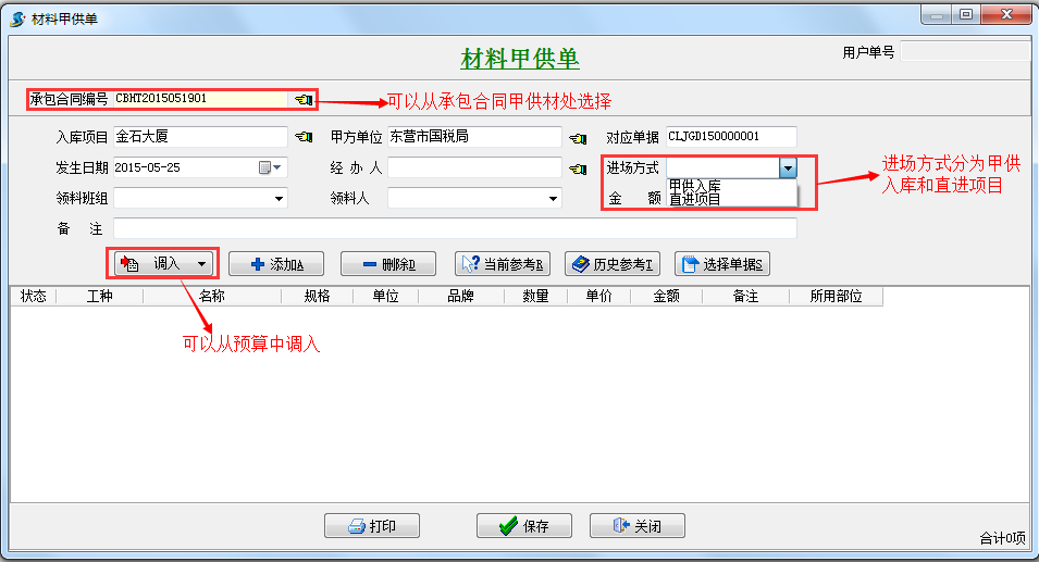 點(diǎn)擊主菜單【材料】->【材料甲供單】->【新建】打開(kāi) 新建【材料甲供單】窗口 界面如下: