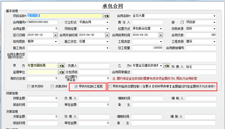 如果在工程甲供材料管理中設(shè)置成甲供材料扣除工程款,需要在編輯承包合同時(shí)在甲供材扣除工程款處打上勾。如下圖