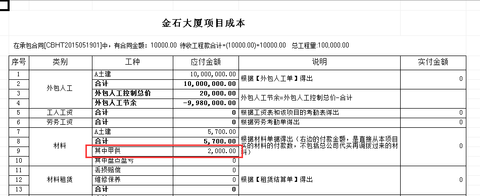 當(dāng)不勾選上甲供材計(jì)入工程成本時(shí),甲供材這顯示為0。如下圖: