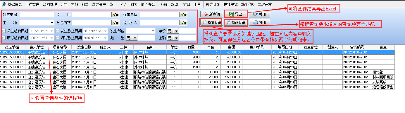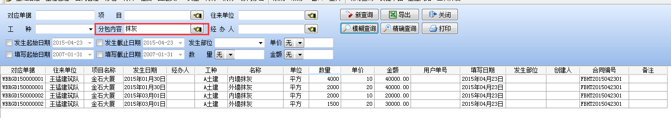 在分包內容中輸入"抹灰"點擊【模糊查詢】后結果如下: