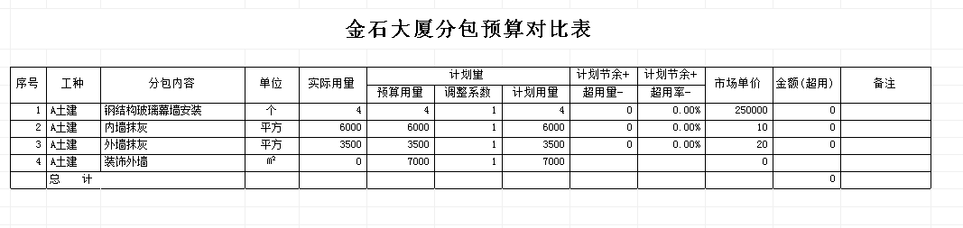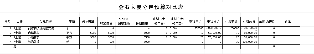備注:調整系統(tǒng)說明:在實際的工程量投標中,某些施工企業(yè)為了中標而做低預算量,還有其它的原因如:一些分包根據(jù)以往的施工經(jīng)驗總會有一定的偏差。這里用調整系數(shù)是為了將最終要參與比較的【計劃用量】、【計劃用量】調整到接近于預期最真實的值。