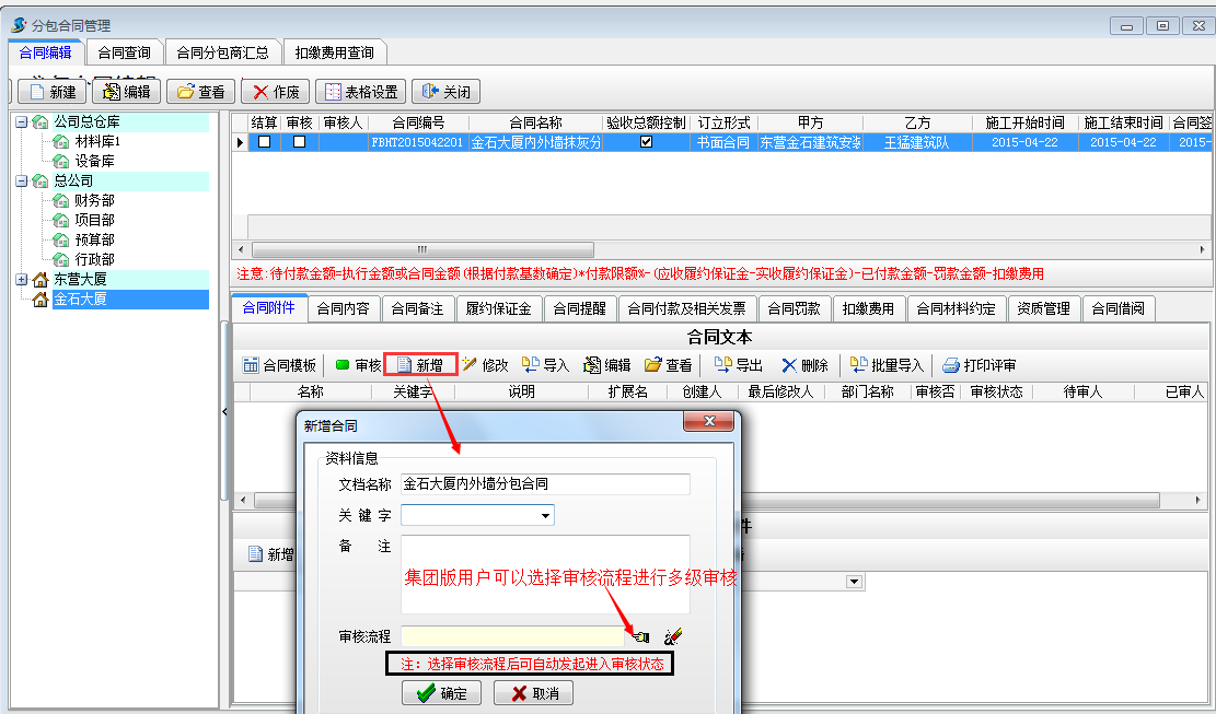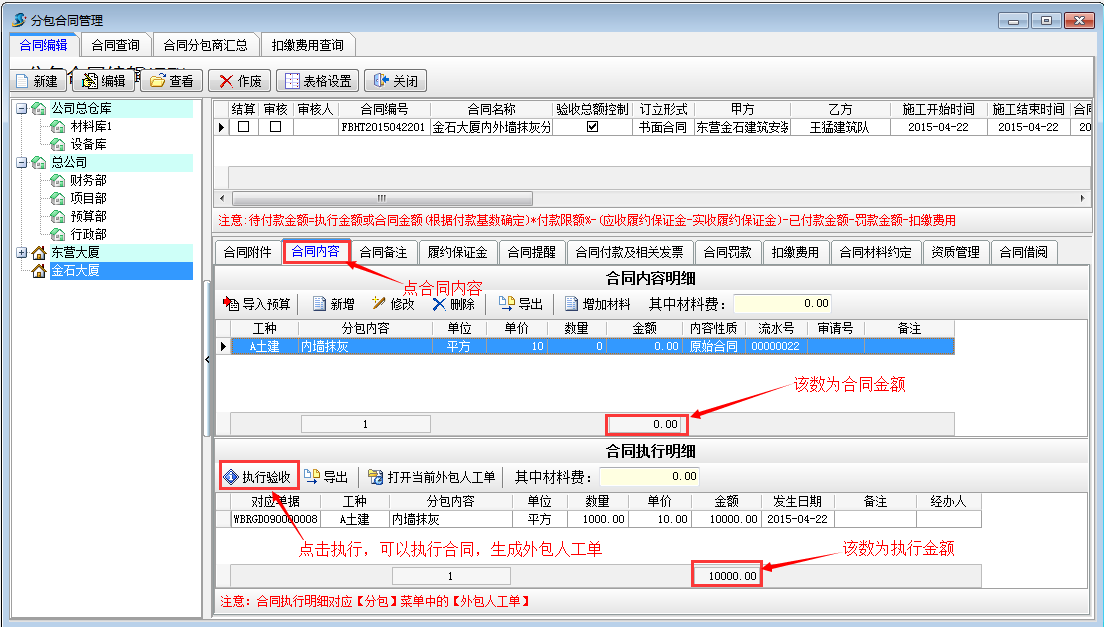 經(jīng)年底現(xiàn)場審核,確定完成內墻4000平米,外墻2000平米,向施工隊付分包款,并扣除生活費。我們在合同內容處選擇執(zhí)行驗收或者直接做外包人工單,外包人工單可進行多級審核.