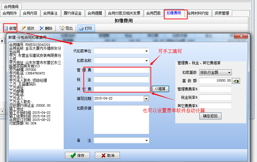 選中[金石大廈]項目點擊【新建】來建立一個合同,界面如下: