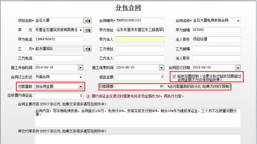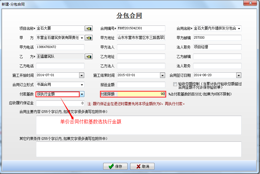 上圖帶紅框的注意填寫正確,其中帶*為必填項。尤其注意【付款基數(shù)】、【付款限額】這些項都會直接影響到該合同的待付款。