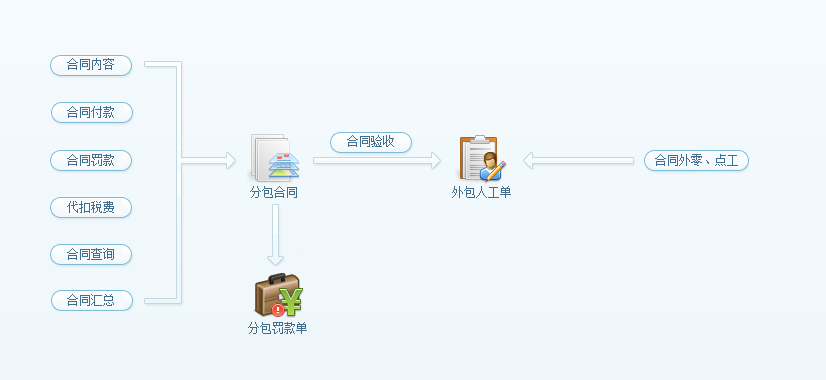 工程項目分包管理,可用于統(tǒng)計專業(yè)分包產(chǎn)生的成本及臨時雇用的零工成本。如軟件流程圖所示:分包成本是由外包人工單產(chǎn)成,其來源可分為兩部分,第一:來自分包合同中的合同驗收,第二:來自合同外零、點工驗收。