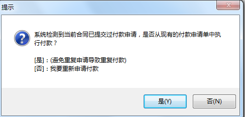 在合同付款及相關發(fā)票處點擊付款生成付款申請單,系統(tǒng)會自動提示你已有預付款。