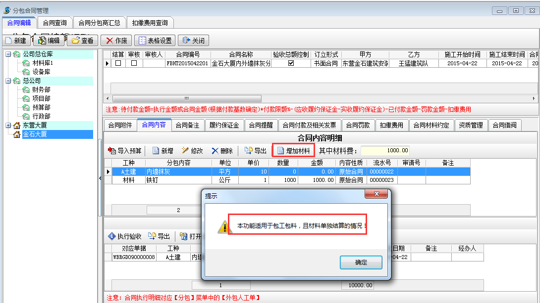 其中在包工包料而且材料單獨結算的情況下,可設置單獨的材料費。