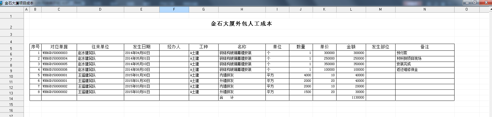 注:如果項目完成后需要記錄對方開據(jù)的發(fā)票,我們可以做一個總的外包人工單(以發(fā)票金額),這樣讓發(fā)票單對應外包人工單就可以了。(因為分包管理收到發(fā)票必須對應外包人工單)
