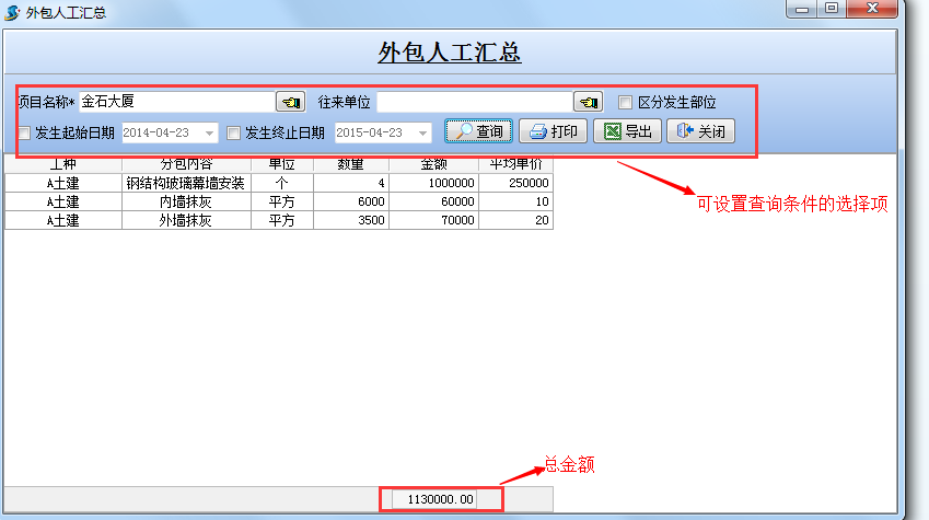 (1)【外包人工明細查詢】是用來查詢所有【外包人工單】中已經(jīng)發(fā)生的分包內容明細。如下圖: