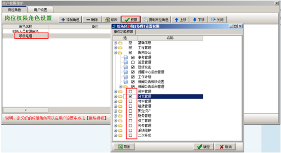 選中崗位角色名稱,點擊“權(quán)限”按鈕彈出“給崗位角色設(shè)置權(quán)限”的按鈕,在給崗位角色分配權(quán)限的功能模塊打鉤,設(shè)置完成后點擊“確定”按鈕,如圖: