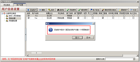 “用戶添加”完成后系統(tǒng)提示添加用戶完成,是否給用戶分配權(quán)限角色,如圖: