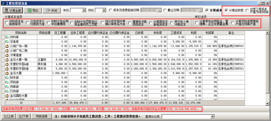 “工程經(jīng)營狀況表”用來查詢公司經(jīng)營狀況,進(jìn)入“工程管理”的模塊,點(diǎn)擊“工程經(jīng)營狀況表”,查看所有工程項(xiàng)目的經(jīng)營狀況,可選擇計(jì)算成本的選項(xiàng),如圖: