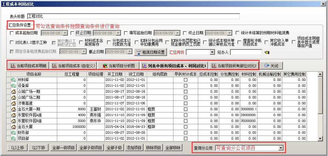 查看項(xiàng)目與項(xiàng)目之間的成本利潤對(duì)比,輸入查詢條件,點(diǎn)擊“列表中所有項(xiàng)目成本利潤對(duì)比1”,如圖