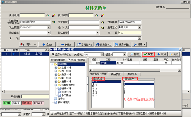 (1)、相關(guān)規(guī)格和品牌設(shè)置好后,在做材料相關(guān)單據(jù)時(shí)系統(tǒng)會(huì)自動(dòng)列出以供選擇。