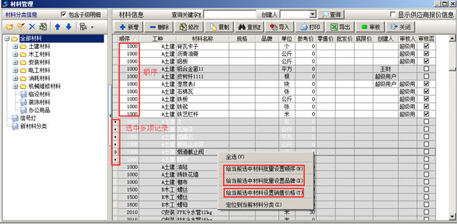 按住鍵盤的CTRL鍵,選中多條材料信息,點(diǎn)擊鼠標(biāo)右鍵批量設(shè)置順序或批量設(shè)置品牌。如圖:
