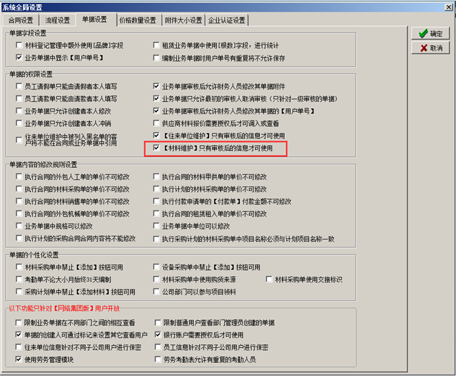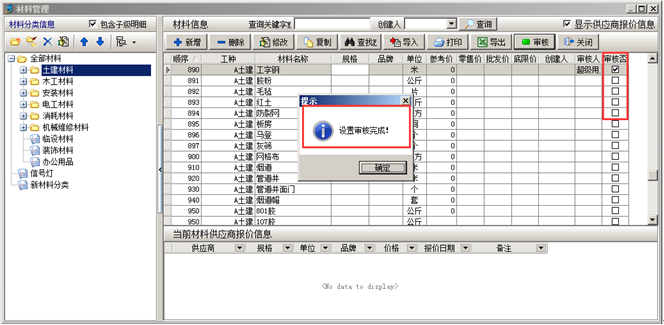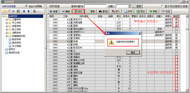 在金石工程管理軟件中可對(duì)添加的“材料信息”進(jìn)行審核(此功能為可選功能)。如圖: