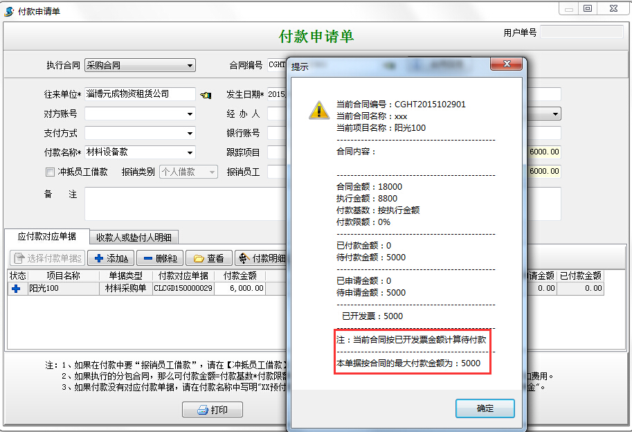 現(xiàn)在針對(duì)該采購(gòu)合同進(jìn)行付款,根據(jù)軟件控制,最大可付金額為發(fā)票金額5000,超過(guò)5000,軟件會(huì)有超付提示,并且并且付款申請(qǐng)單或者付款單不能保存。如下圖: