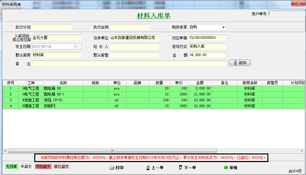 在工程項目管理系統(tǒng)中填入材料入庫單、其他入庫單成本控制金額,當超過該金額時,系統(tǒng)會自動提示。假如我們成本控制金額填入30000我們在新錄入材料入庫單、其他入庫單時超過控制金額30000會自動提示。這里咱們一采購入庫單為例,如下圖