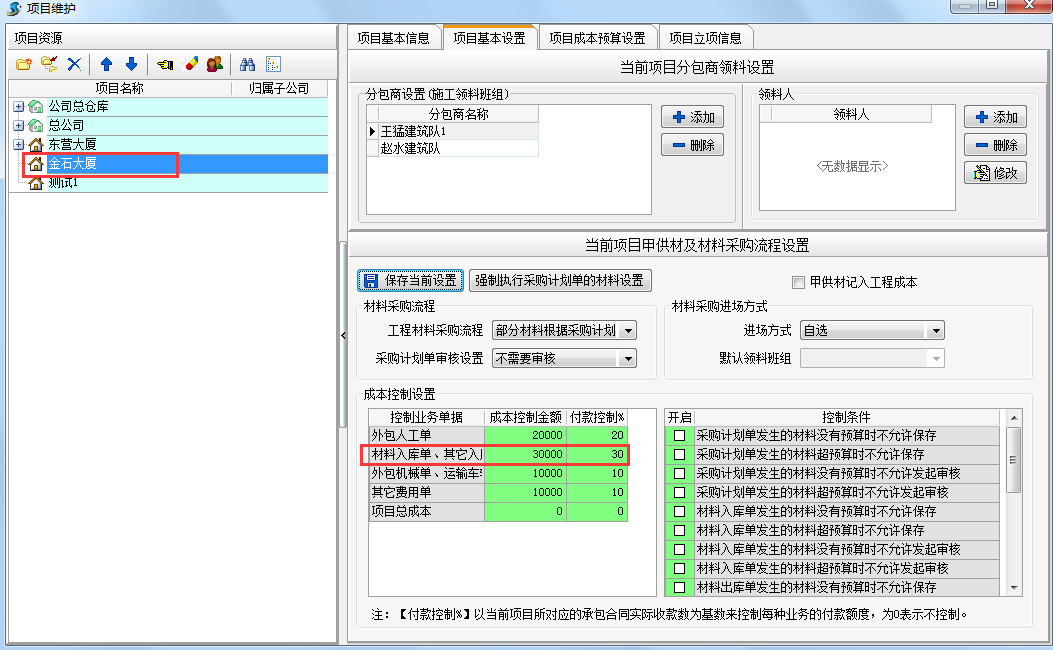 在工程項目管理系統(tǒng)中新建項目時設(shè)置成本控制金額和付款控制比例。具體設(shè)置方法【工程管理】模塊?【項目維護】項目基本設(shè)置