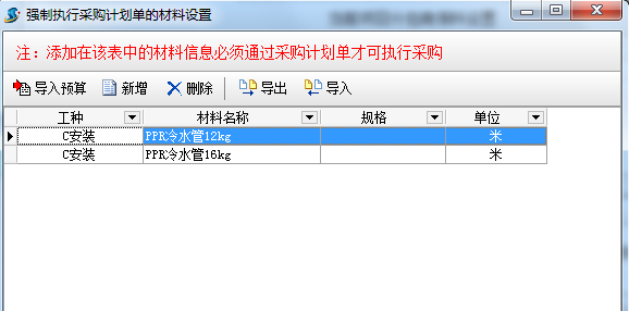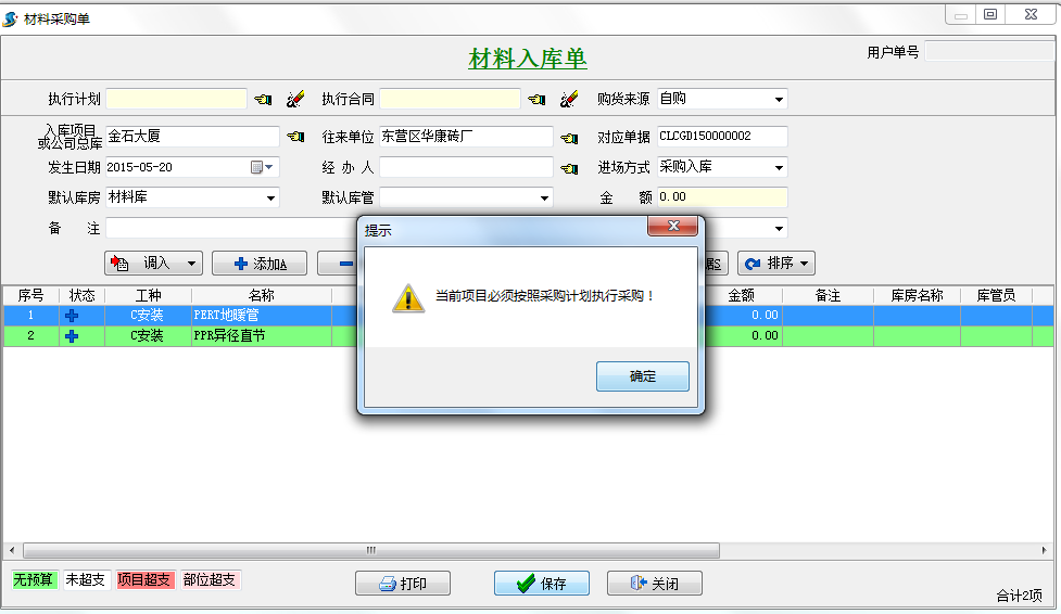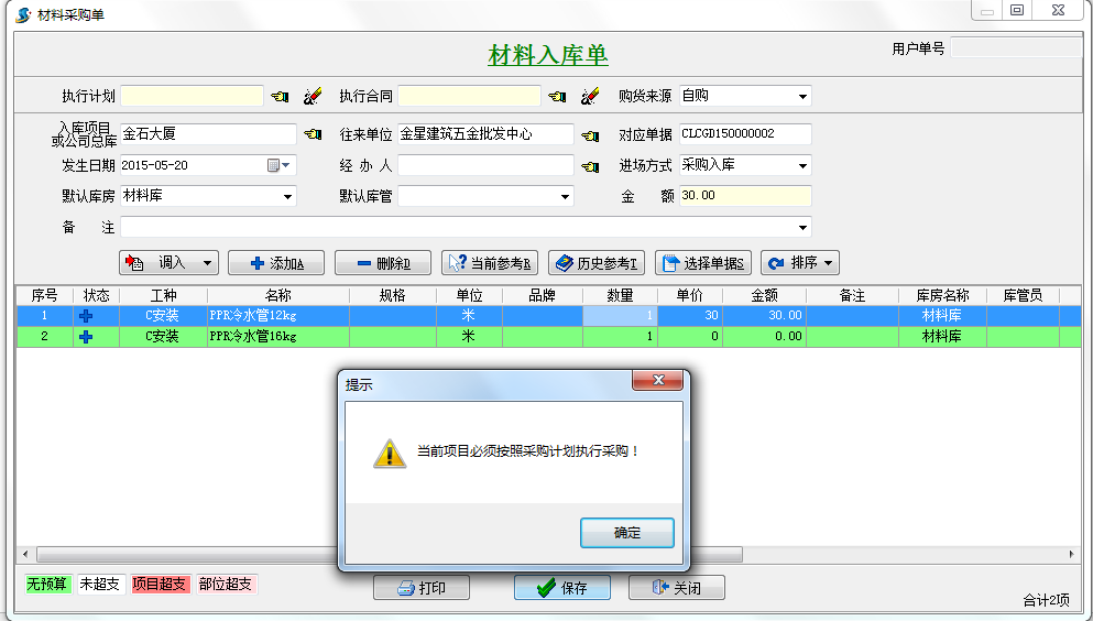在施工管理軟件中強制執(zhí)行采購計劃單的材料如果該材料沒有工程項目采購計劃單時材料采購單是不允許保存的。