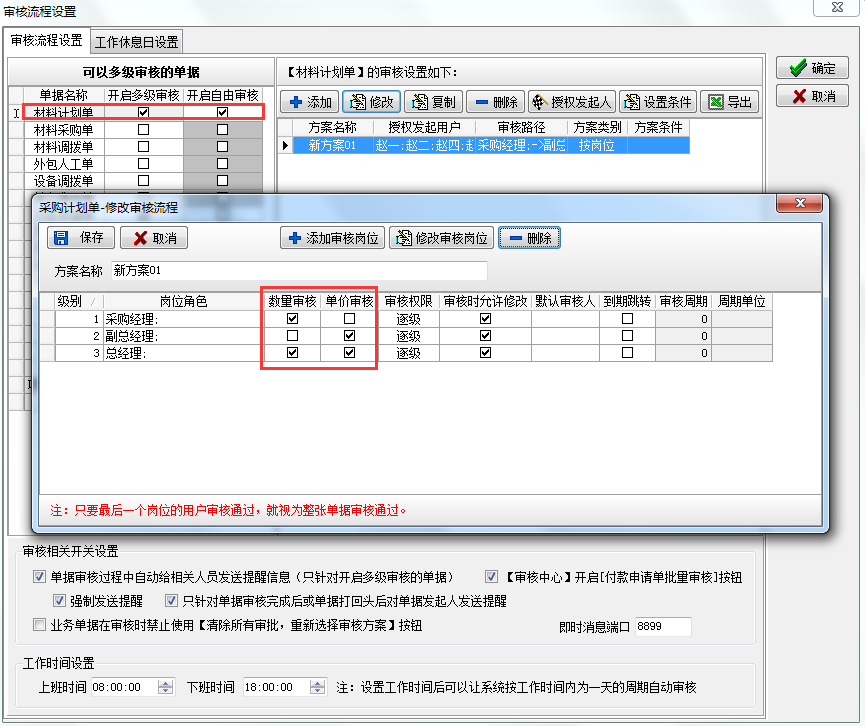 具體設置方法:材料計劃單審核設置為:需要審核。材料采購流程又為:根據(jù)采購計劃單或者部分材料根據(jù)采購計劃單