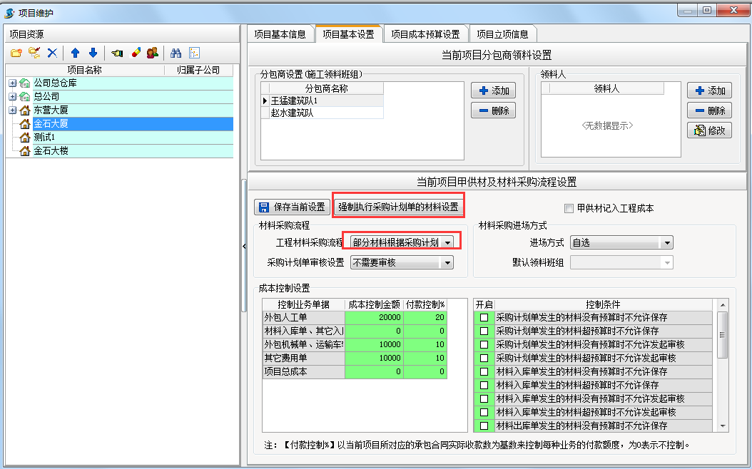 在工程管理軟件中如果選擇部分材料根據(jù)采購計劃單,則可以設置強制執(zhí)行采購計劃的材料。如下圖