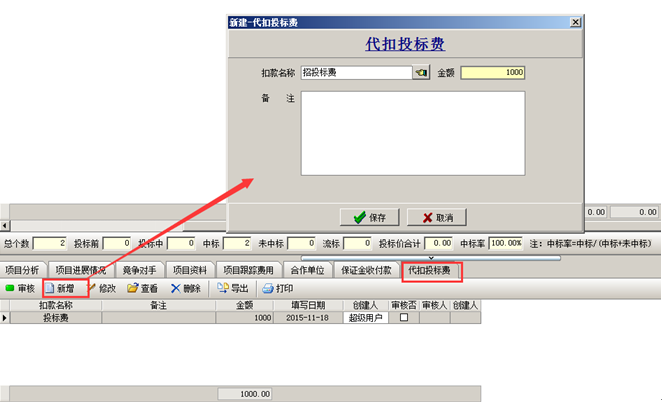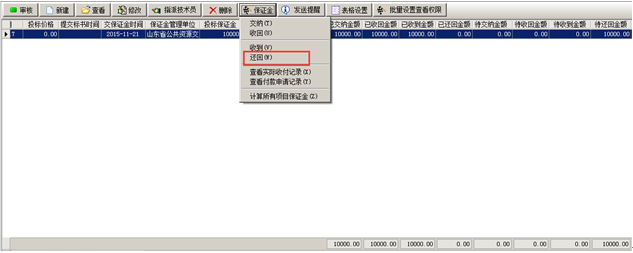 單據(jù)創(chuàng)建完成,系統(tǒng)在“還回金額”中扣除【代扣投標(biāo)費】。如圖: