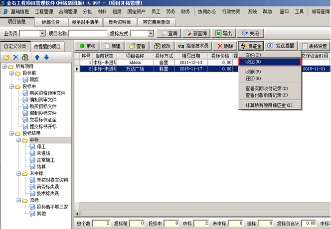 我方要從“保證金管理單位”將投標(biāo)保證金收回。工程管理軟件的項目開拓中選中對應(yīng)的項目,在“保證金”菜單中選擇“收回”,如圖所示: