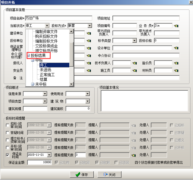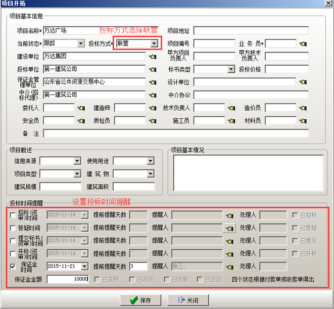 項目狀態(tài)編輯維護完成之后可在工程管理軟件中建立項目。在工程管理軟件的“項目開拓”中輸入包括個往來單位以及負(fù)責(zé)人等項目基本信息。也可在投標(biāo)時間提醒里面設(shè)置“招標(biāo)(資審)時間”,“答疑時間”,“提交標(biāo)書時間”,“開標(biāo)時間”,“保證金”提醒時間,時間設(shè)置完成之后,被提醒的用戶會在相應(yīng)的時間收到相關(guān)的提醒內(nèi)容。投標(biāo)保證金,在投標(biāo)保證金對應(yīng)的復(fù)選框打鉤,設(shè)置投標(biāo)保證金的時間,提前提醒的天數(shù),被提醒人以及金額。如圖所示: