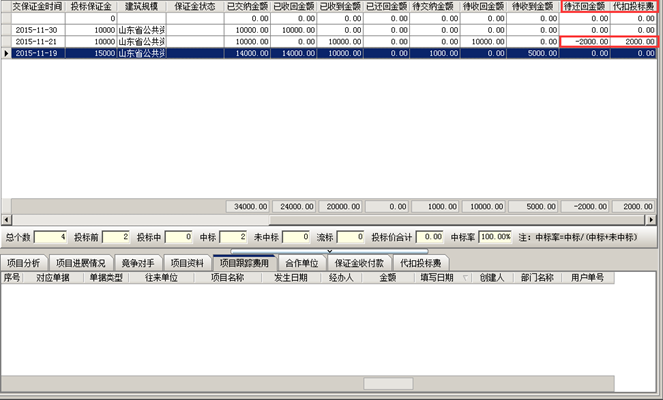 投標(biāo)保證金還回給掛靠單位。項目開拓中會提示“待還回金額”。如圖所示: