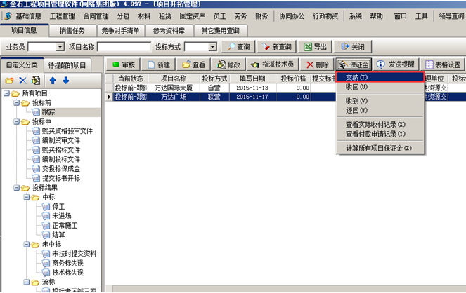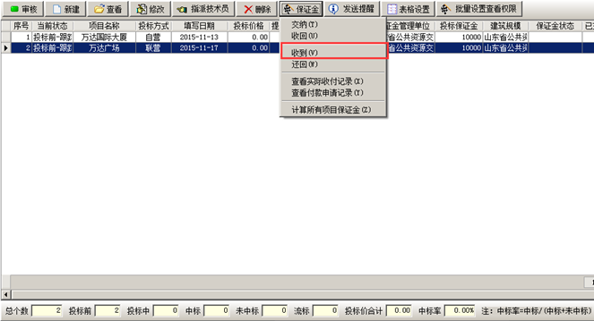 掛靠單位將投標(biāo)保證金交給我方。我方在工程管理軟件的項目開拓列表中找到對應(yīng)項目,在“保證金”菜單中點擊“收到”,如圖: