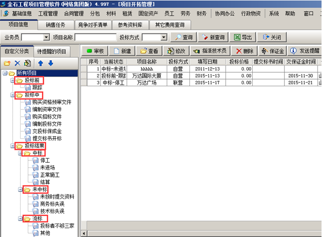 在金石工程管理軟件中,項目是在系統(tǒng)的“項目開拓”中建立項目開始的。 根據(jù)項目所處的階段在工程管理軟件的項目開拓中建立項目基本信息。工程管理軟件中項目開拓階段項目有三個狀態(tài):“投標(biāo)前”、“投標(biāo)結(jié)果”,“投標(biāo)結(jié)果”包括“中標(biāo)”、“未中標(biāo)”和“流標(biāo)”,系統(tǒng)定義的項目的基本狀態(tài)不可編輯或更改,若項目有其他狀態(tài)可在個基本狀態(tài)下建立子狀態(tài),子狀態(tài)的名字可進行編輯。如圖所示: