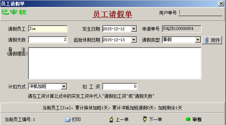 注:“扣工資”金額這里不用填寫,因為在本例中【工資項目定義】中“請假扣工資”要通過公式來得出。如果,“請假扣工資”不根據【工資項目定義】公式計算,每張請假單單獨體現(xiàn)的話,這里需要填寫好“扣工資”金額。