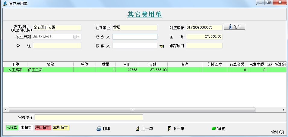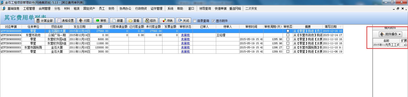 使用工程管理軟件【財務(wù)管理】-【其他費用單】記錄員工工資合計,詳細(xì)的excel工資表可導(dǎo)入到其他費用單單據(jù)附件中。如下圖: