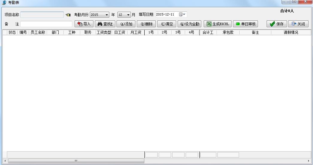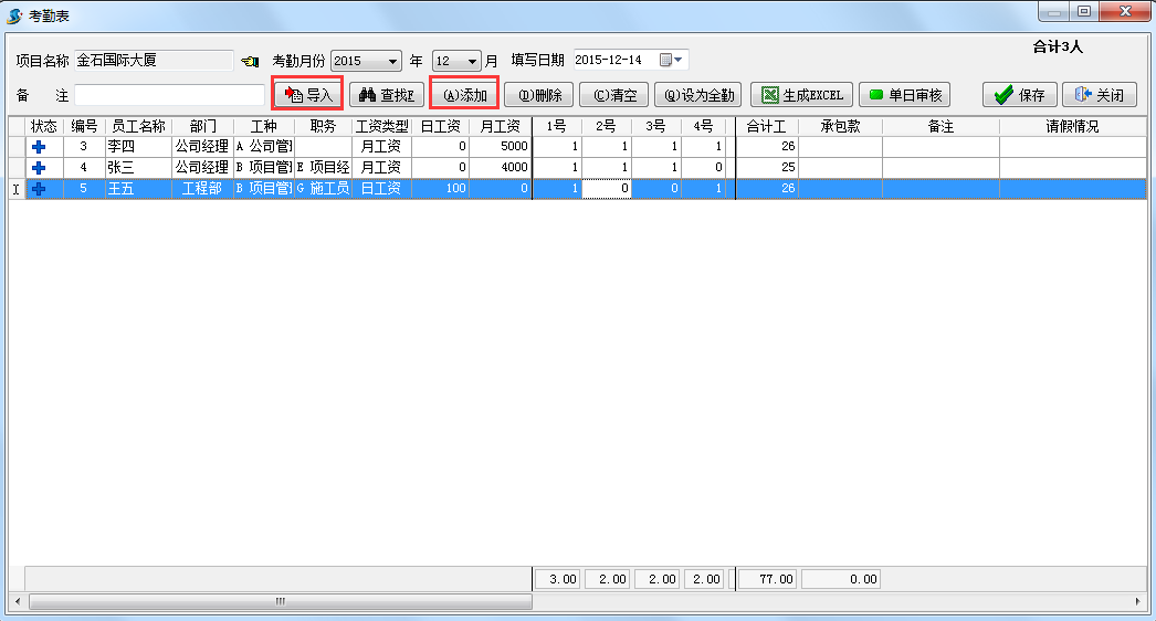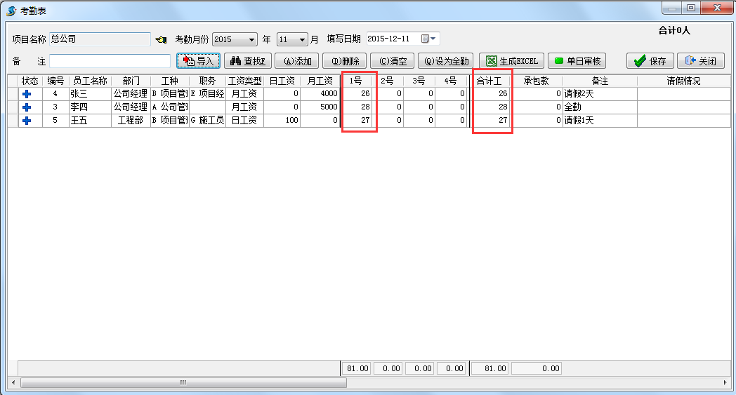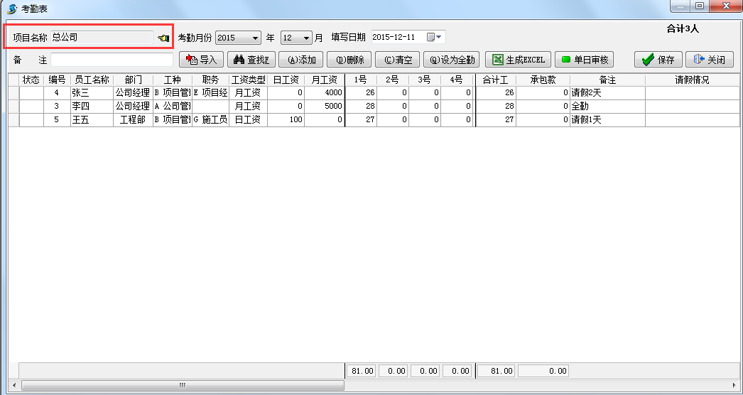 在工程管理軟件只記錄每人每月的合計工考勤,考勤單不區(qū)分項目,合計工填寫在考勤表的任意一天即可。
