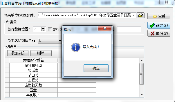 本地帶有員工本月五金和節(jié)日獎字段的表格中所對應(yīng)的列分別是“B”列和“C”列,列名對應(yīng)好之后,點擊“確定”進(jìn)行替換,導(dǎo)入并替換完成之后會彈出“導(dǎo)入完成”的對話框,如圖: