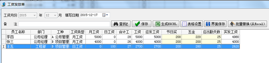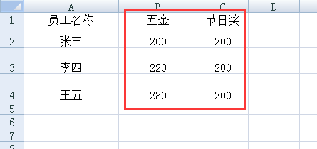 當(dāng)前新生成的工資表中,員工的五金及節(jié)日獎價均為0,如圖: