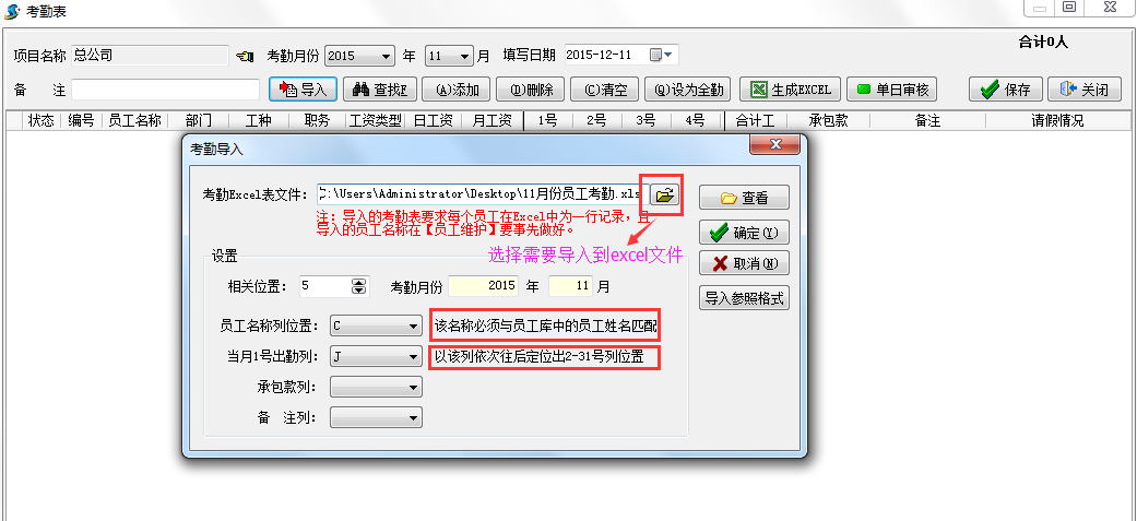 需要導(dǎo)入的Excel只有每人每月的合計工考勤,這樣只把每人的合計工導(dǎo)入到考勤表的任一天就可以,只要考勤表的合計工與Excel表的一致就行。