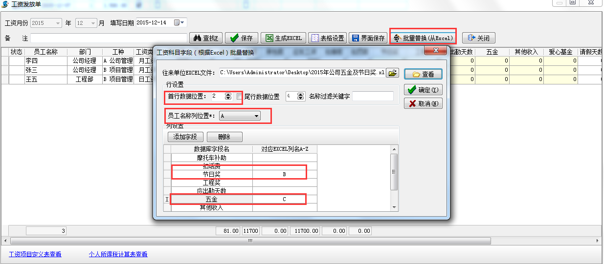 工程管理軟件 員工工資表的“批量替換”功能可將本地Excel表格中的工資數(shù)據(jù)替換到當(dāng)前的工資表中,可用于替換每月每人不同的工資項目,例如計件,計件工資,五金,節(jié)日獎等。