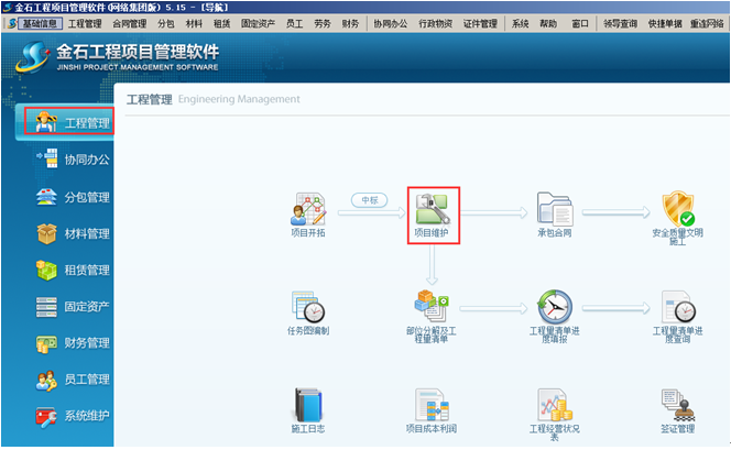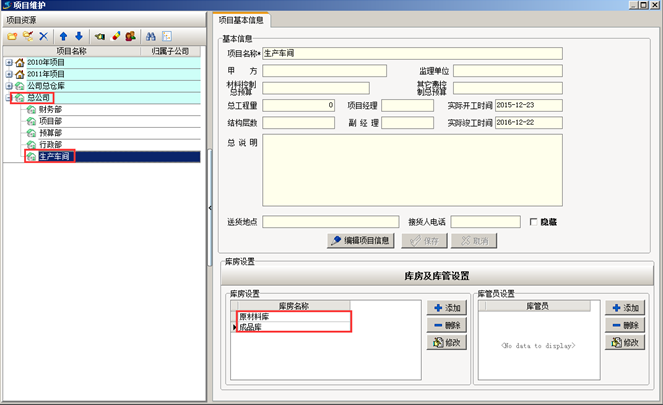 首先在金石工程管理軟件“工程管理”的“項目維護(hù)”中,在公司節(jié)點下建立“生產(chǎn)車間”并設(shè)立對應(yīng)庫房,這樣便于對用于生產(chǎn)的原材料或者產(chǎn)品進(jìn)行管理。如圖: