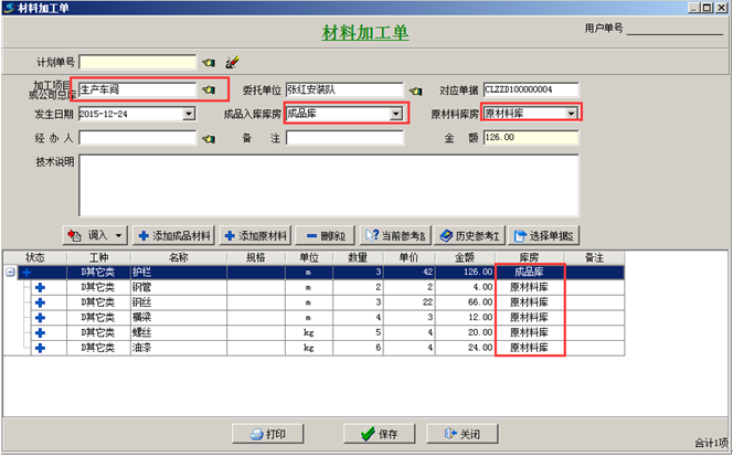 注:(1)在材料加工單的材料列表中對應(yīng)好各材料所在的庫房。否則系統(tǒng)會默認(rèn)為默認(rèn)的“成品入庫庫房”或“原材料庫房”。