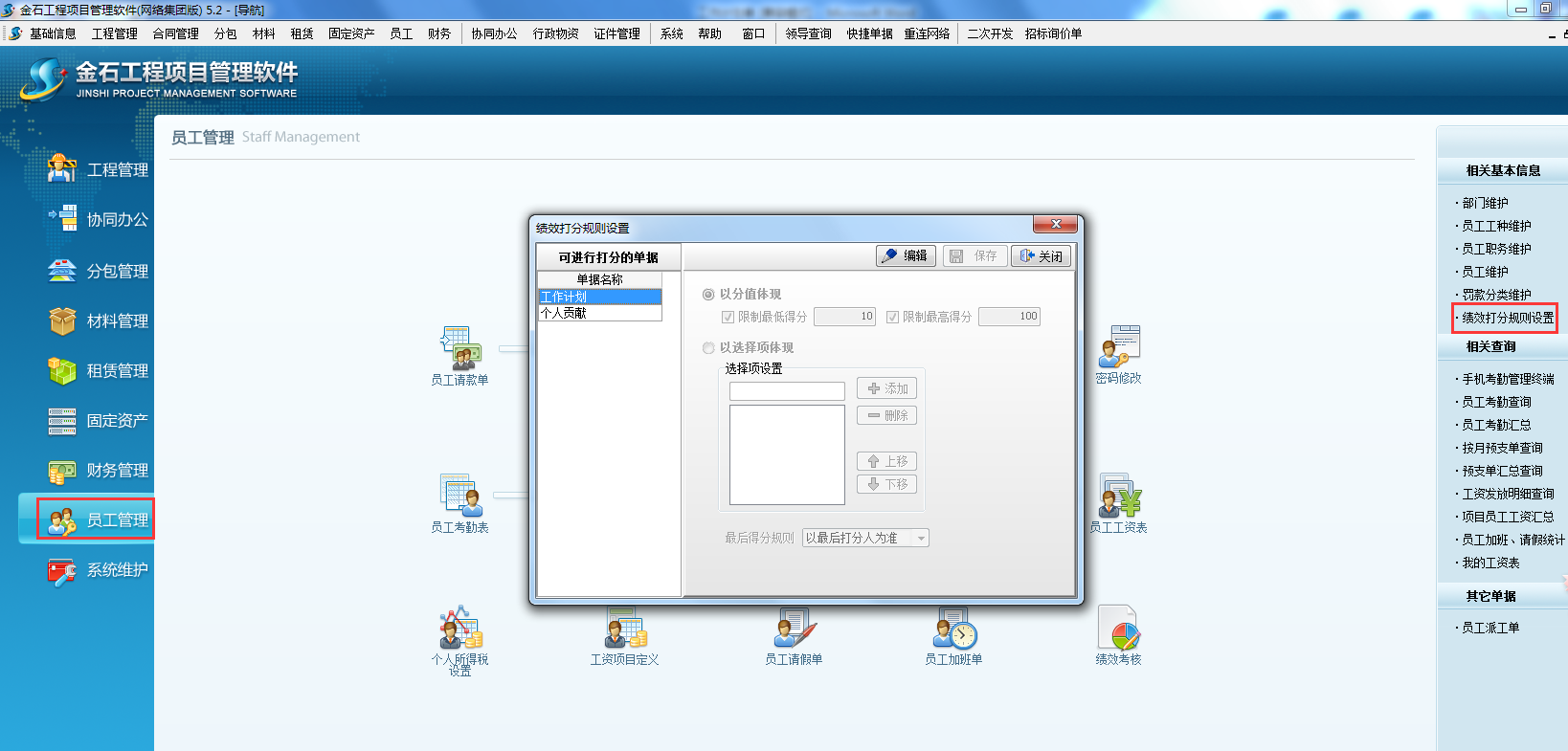 打開項(xiàng)目管理軟件【員工管理】-【績(jī)效打分規(guī)則設(shè)置】如下圖: