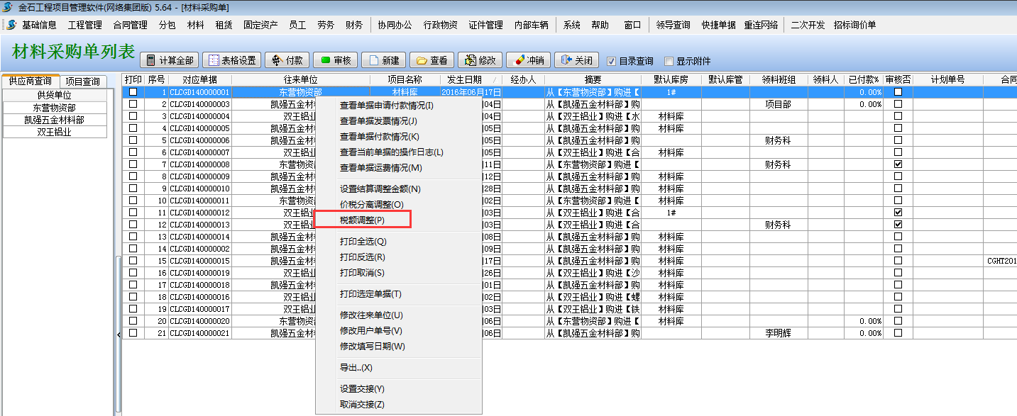 通過工程項(xiàng)目管理軟件價(jià)稅分離后,分離出的稅額可能與實(shí)際的稅額有一定的誤差,可通過選定單據(jù)右鍵選擇稅額調(diào)整,實(shí)現(xiàn)對(duì)稅額的調(diào)整。如下圖: