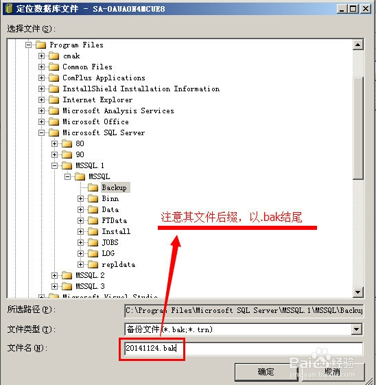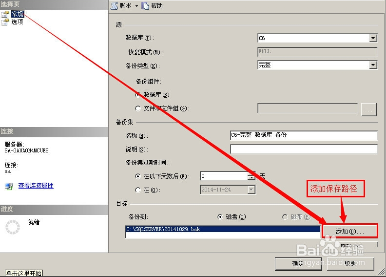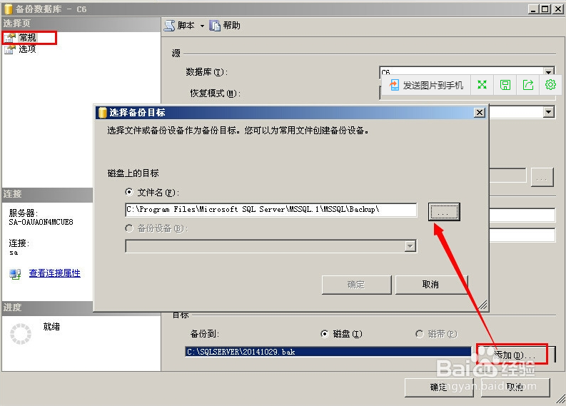 4、彈出備份數(shù)據(jù)庫窗口,在常規(guī)中設(shè)置保存路徑,步驟為首先點擊左邊的常規(guī),然后點擊添加,在彈出框中點擊省略號選擇文件的保存,后綴名稱為.bak,填寫完成之后,點擊確定