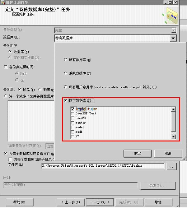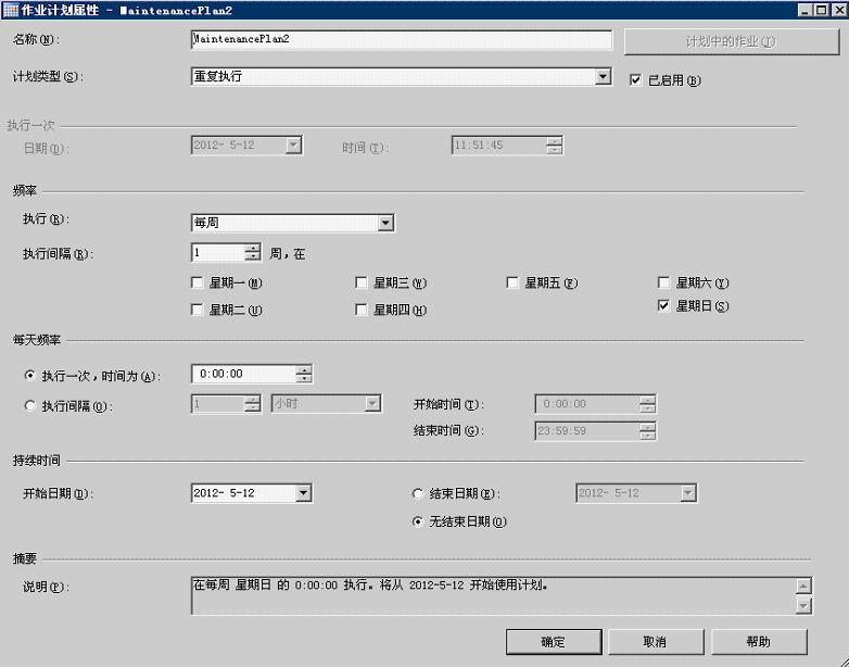 點擊【更改】按鈕,彈出如圖所示【計劃作業(yè)屬性】對話框。在該對話框里可以設(shè)置備份數(shù)據(jù)庫的時間及頻率,設(shè)置完畢后單擊【確定】按鈕回到【選擇計劃屬性】窗口,再單擊【下一步】按鈕。