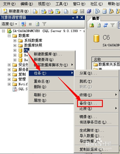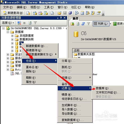 5、備份完成之后,如果有需要還原的需求的話,可以右擊數(shù)據(jù)庫名,然后鼠標移動到任務,選中還原,最后點擊數(shù)據(jù)庫