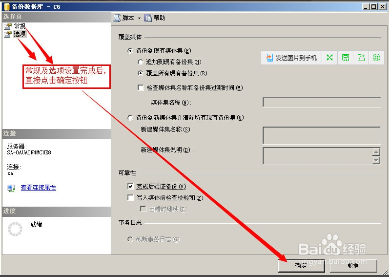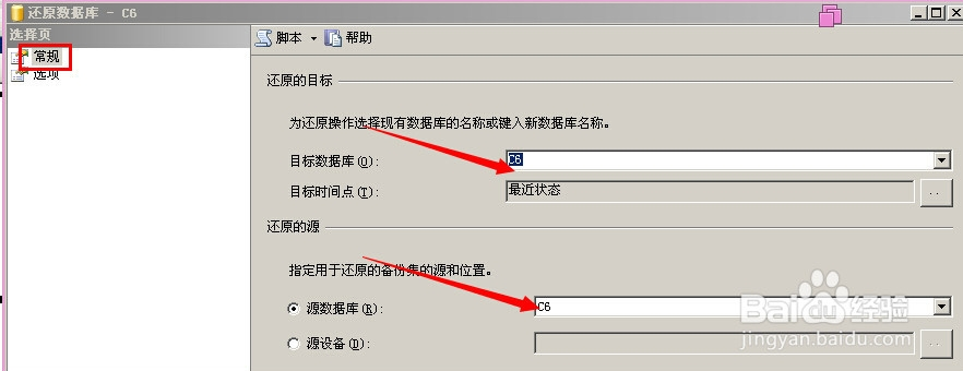 6、彈出還原數(shù)據(jù)庫窗口,在常規(guī)中檢查目標數(shù)據(jù)庫名稱與源數(shù)據(jù)庫名稱是否正確、在選項中找到備份的數(shù)據(jù)庫文件
